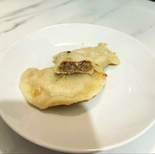 Do farszu możesz dodać czosnek niedźwiedzi lub szczyptę majeranku – obie przyprawy świetnie współgrają z mięsem i nadają farszowi ziołowego charakteru. Gotowane pierogi najlepiej smakują podsmażone na gęsim smalcu lub maśle klarowanym. To złocista, chrupiąca skorupka i intensywny, domowy smak.
