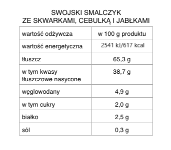 Smalec z jabłkiem — tak jak wszystkie smalczyki w naszym asortymencie — nie zawiera żadnych sztucznych dodatków, konserwantów ani wypełniaczy.