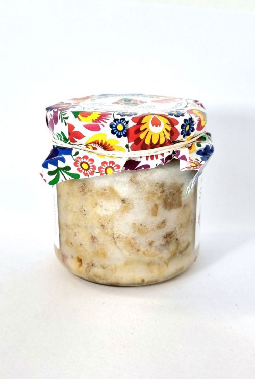 Wytapiany z najlepszej jakości słoniny, smalec ze skwarkami charakteryzuje się delikatną, kremową konsystencją, którą wzbogacają chrupiące kawałki skwarek. To właśnie one nadają smalcowi bogatej tekstury, a ich lekko wędzony aromat doskonale harmonizuje z delikatnie zeszkloną cebulką. Cebula wprowadza subtelną słodycz, która przełamuje intensywny smak skwarek i tworzy perfekcyjną równowagę smaków.