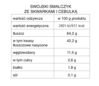 Naturalny, bez konserwantów i sztucznych barwników, oferując prostotę i autentyczność polskiej kuchni. Sięgnij po tradycję i rozkoszuj się smakiem swojskiego smalczyku, który jest doskonałym wyborem dla tych, którzy cenią domowe, naturalne produkty. Nasz smalczyk jest idealnym dodatkiem do pieczywa, który świetnie sprawdzi się zarówno na śniadanie, jak i podczas wieczornych spotkań przy stole.