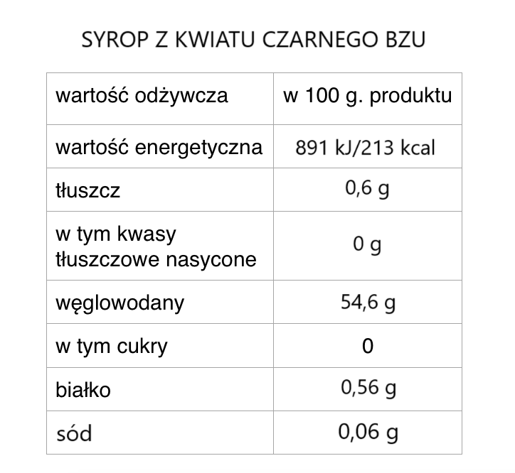 Syrop otrzymany ze zdrowych, dojrzałych i wyselekcjonowanych kwiatów czarnego bzu.